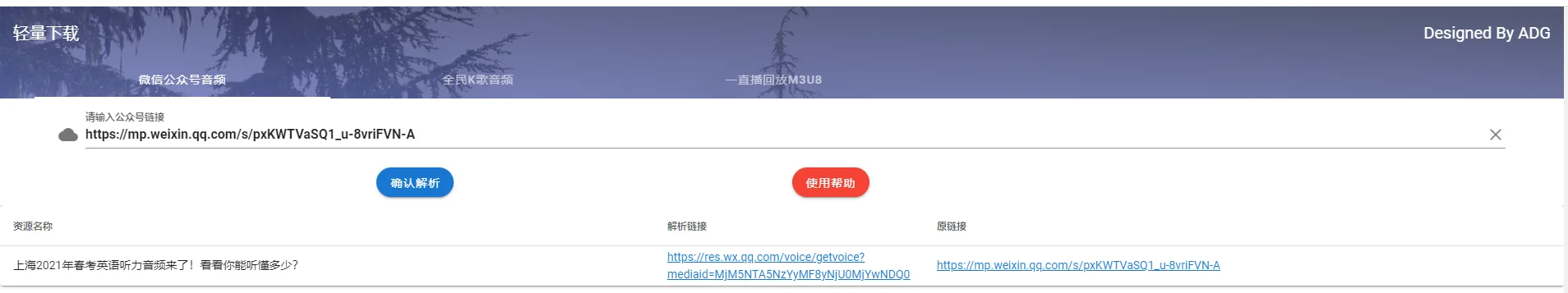 目前轻量下载的所有功能都是免费使用,当前版本可以解析 微信公众号的音频 全民K歌的音频 一直播回放的M3U8链接